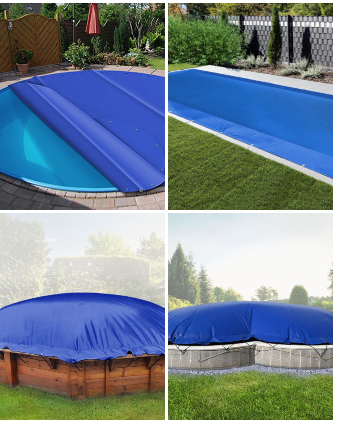 - Aufblasbare Poolabdeckungen sind in rechteckigen, ovalen und runden Formen erhältlich. Darüber hinaus bieten wir auch spezielle Formen wie Achtform, Achteckig, Rechteckig mit eckiger Treppe, Rechteckig mit römischer Treppe und L-Form an. Rechteckige aufblasbare Planen gibt es in Größen von 4m x 3m bis 10m x 5m. Ovale Abdeckungen reichen von 4,50m x 2,50m bis 11,00m x 5,50m. Runde Abdeckungen sind mit Durchmessern von 200cm bis 750cm verfügbar.