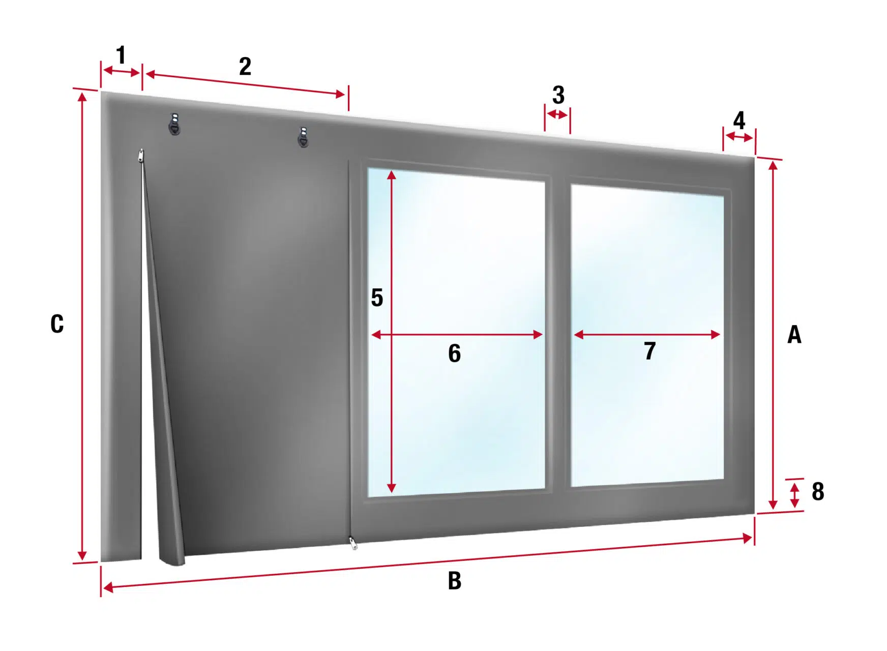 - 1x eingearbeitete Tür (bestehend aus zwei hochwertigen YKK Reißverschlüssen). Über der Tür werden Aufrollriemen angebracht. Die Gesamthöhe der Tür beträgt zwischen max. 220cm.