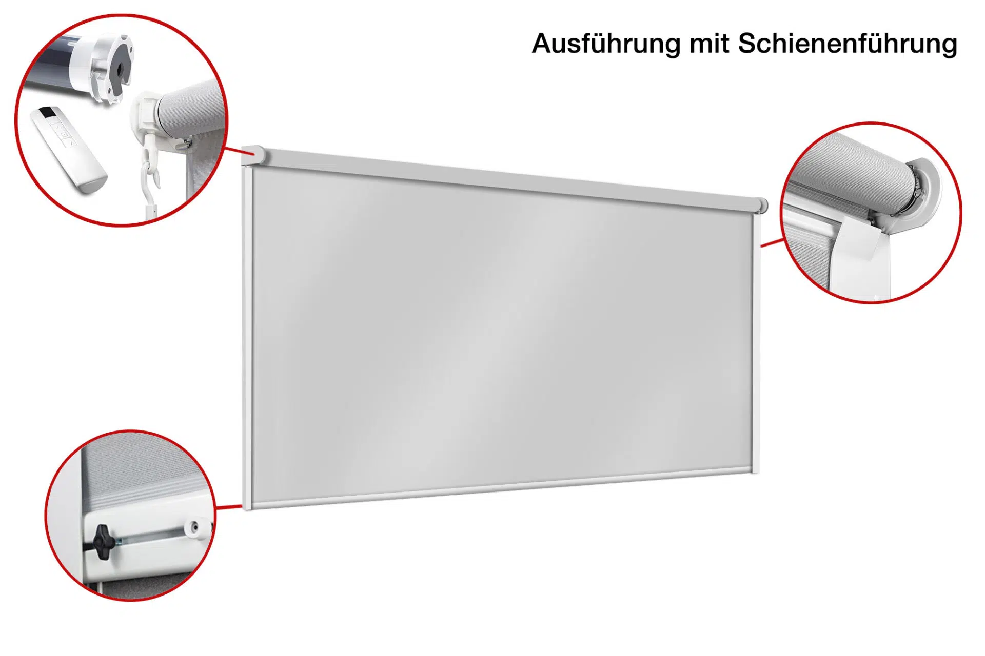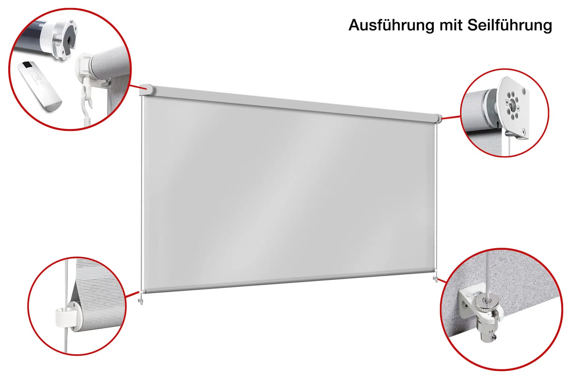 (Bitte beachten Sie, dass bei der Führungsart „Seilführung“ der Stoff (in diesem Fall das farbige PVC-Planenmaterial) aufgrund des vorhandenen Seilspanntopfes nicht bis ganz nach unten gezogen werden kann. Der Luftraum beträgt ca. 2cm. Bei der Führungsart „Schienenführung“ setzt die untere Führungsschiene auf dem Boden auf bzw. kann bis zu dem gewünschten Haltepunkt geführt werden.)