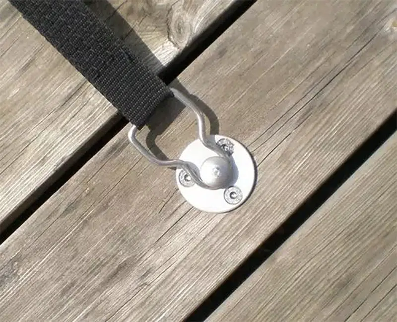 Bei unseren Bodenankern für Holzflächen, finden Sie zusätzlich innerhalb der Rundplatte des Bodenankers drei Öffnungen vor. Mit unseren mitgelieferten Edelstahl-Senkkopfschrauben wird der Bodenanker nun über diese Öffnungen zusätzlich verschraubt.